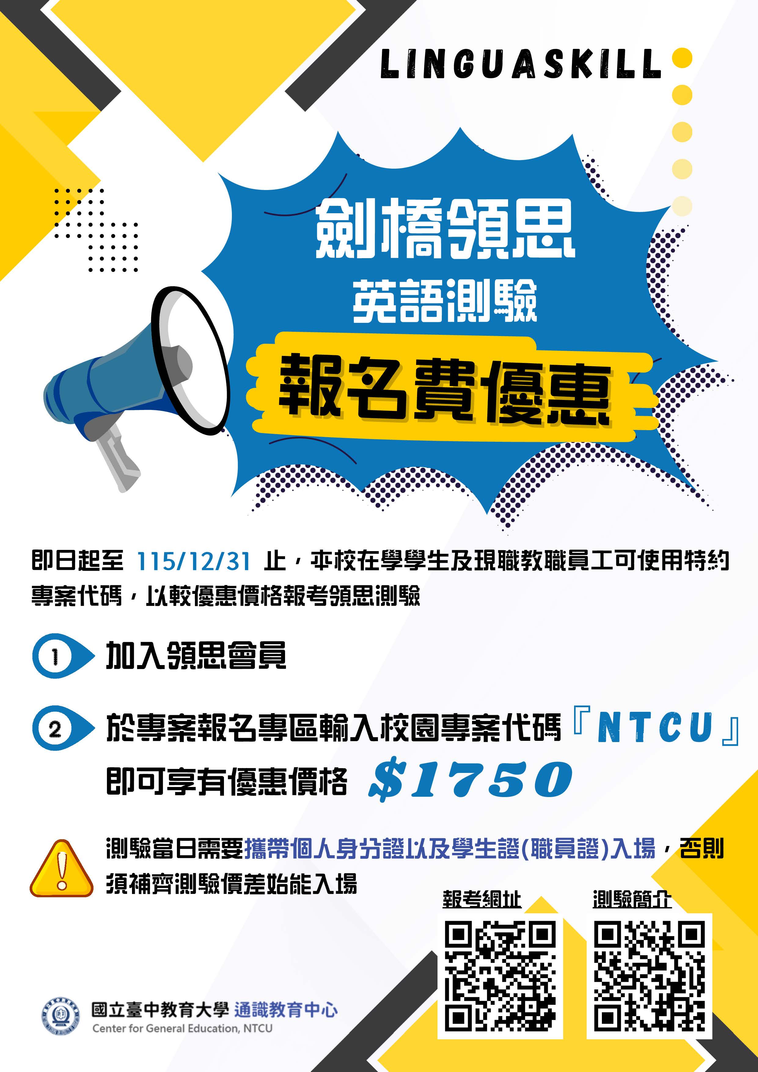 (一)學生報考前須先加入領思會員,並於專案報名專區輸入校園專案代碼「NTCU」才能享有報名費優惠,若未輸入代碼者無法享優惠價格,須依測驗原價1950元報考。
